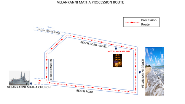 Hotel Kalyan Inn is one of the best hotels to stay in Velankanni and is situated enroute the procession of our lady of health Velankanni Matha. This feast is visible from our hotel lobby and balcony, providing our customers an opportunity and privilege to witness this sacred and blessed procession.